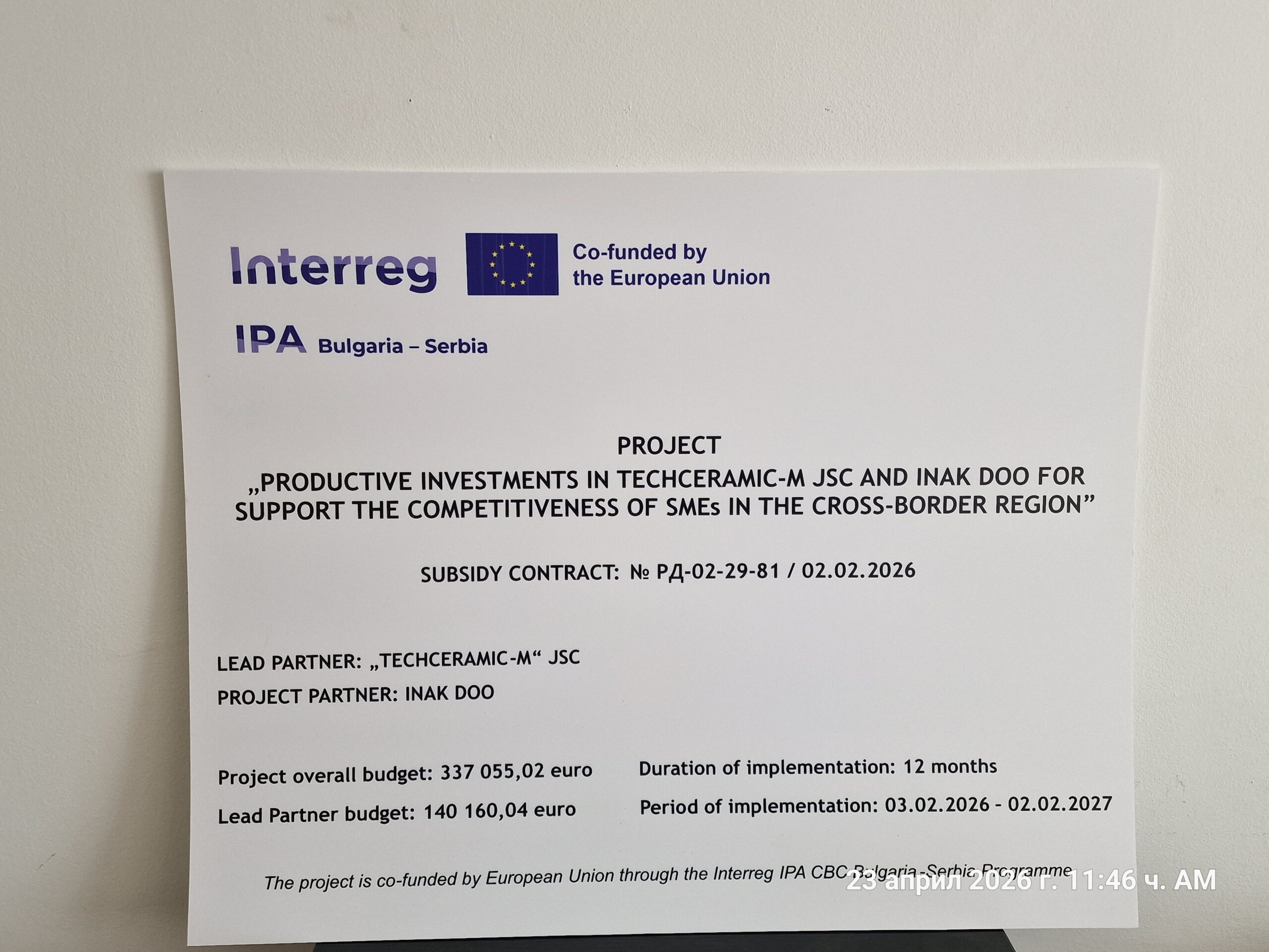 Dana 23. aprila 2026. godine u gradu Mezdri, u Bugarskoj, održana je uvodna konferencija za novinare na kojoj je predstavljen zajednički projekat „Investicije u proizvode u „Tehkeramik-M“ AD i „Inak“ Doo za podršku konkurentnosti MSP u prekograničnom regionu“, CBComepetRegion, finansiran iz Programa za prekograničnu saradnju Interreg VI-A IPA Bugarska – Srbija 2021–2027.